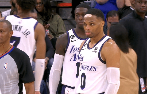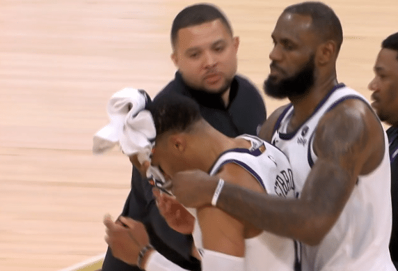 第三节2分钟,威少在禁区二次进攻,持球强打却被科林斯放倒,威少的脑门被打破,血流不止,画面十分残忍,威少情绪失控,站起来就要揍科林斯,詹姆斯第一时间抱住威少,才阻止了冲突,之后詹姆斯抱走威少,并且用毛巾捂住威少的脑袋。