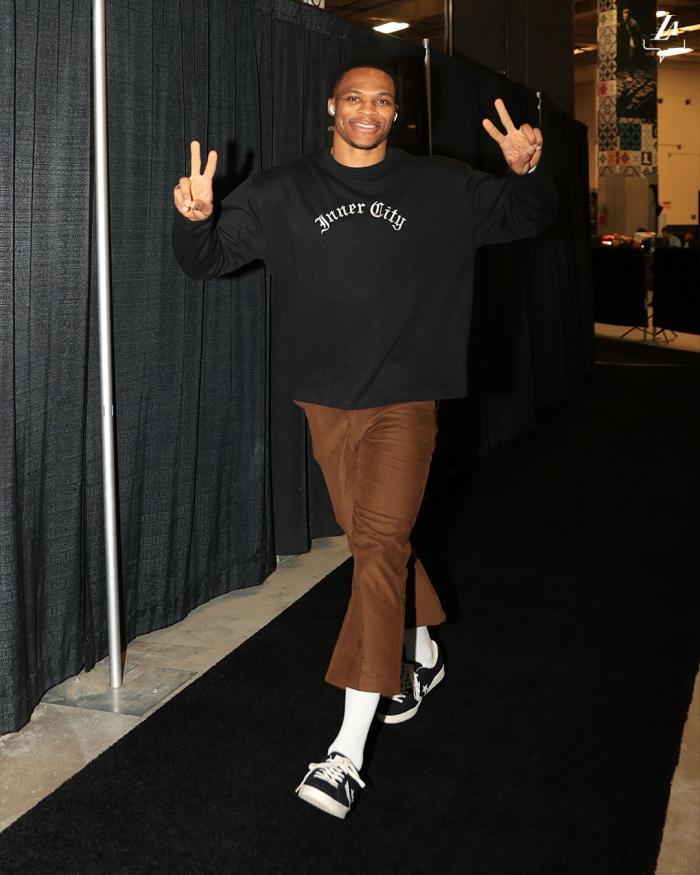 湖人再次对阵马刺,詹姆斯(左内收肌拉伤)带伤出战背靠背的比赛,贝弗利(禁赛)继续缺席;赛前入场时,詹姆斯身穿红色连帽卫衣并且戴着两顶帽子出镜,威少双手比V满脸笑容,浓眉提着包包则是表情严肃。