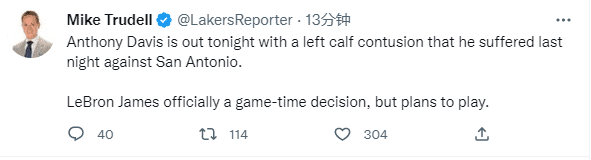 湖人巨头又添新伤:浓眉左小腿被踢伤确定休战 詹姆斯出战背靠背