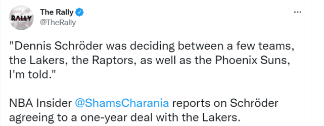 来源:925直播09-17 15:05925直播09月17日,名记Shams报道称,施罗德计划和湖人签下1年264万美元的合同,再次为这支球队效力,为此他拒绝了猛龙、太阳等队的邀请。施罗德本人也第一时间更新社媒,重回湖人后首次发声。名嘴Bill Simmons依然看衰湖人前景,认为得到施罗德湖人也只是西部9号种子。