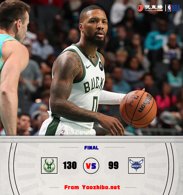 24直播网11月18日讯 NBA常规赛东部季中锦标赛B组,黄蜂主场迎战雄鹿,黄蜂目前3胜7负排在东部第13位,而雄鹿则是7胜4负排在东部第5位。比赛上来,双方就展开快节奏的对攻战,字母哥上来就连续强攻篮下,而三球则是里突外投给出回应,迈尔斯-布里奇斯正式复出登场后手感不错,雄鹿一波8-2首节领先9分,末节双方进攻端命中率都有下降,黄蜂尤其断电严重,雄鹿依靠替补发挥打出11-0进攻波一度反超比分,双方拉锯战,半场雄鹿反超2分。下半场,利拉德手感全开单节轰下18分,而三球也是状态不错单节上双展开对轰,无奈雄鹿全员都找到状态逐渐领先到双位数,末节三球继续撑起球队进攻,而雄鹿全员开花,米德尔顿和比斯利接连扔进三分,分差直接来到20分以上,最终雄鹿130-99轻取黄蜂,拿到3连胜。