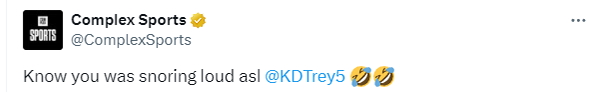杜兰特在大巴山酣睡引热议,美媒《露天看台》表示阿德巴约拍到了杜兰特正在睡觉(笑哭+睡觉表情);Overtime表示阿德巴约侵犯了杜兰特(笑哭表情);Complex Spors表示:知道杜兰特的打呼噜声很大。