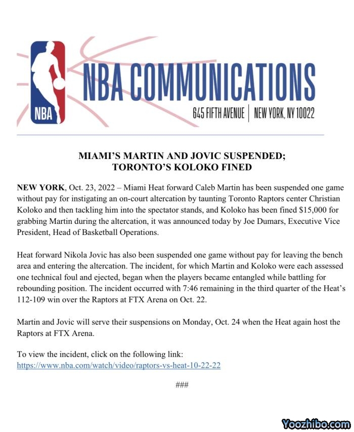 24直播网10月24日,NBA官方正式公布新赛季重磅罚单罚单,热火球星科雷布-马丁和约维奇都被禁赛一场,猛龙球员科洛克被罚款1.5万美元。