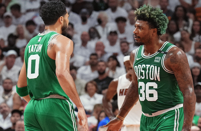 24直播网05月20日讯 今天NBA季后赛东部决赛G2结束了争夺,最终凯尔特人客场取得了一场25分的大胜,系列赛大比分来到1-1平。斯玛特和霍福德归来之后效果立竿见影,尤其是砍下24分9篮板12助攻3抢断的斯玛特,不愧是本赛季常规赛最佳防守球员,他在攻防两端都贡献了超神的表现。双探花组合布朗和塔图姆合砍51分,两人手感都不错。热火的塔克遗憾伤退,巴特勒空砍29分6篮板3助攻的数据。