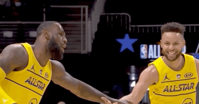 生涯首度合作!詹姆斯助攻库里Logo shot,牵手庆祝画面太美