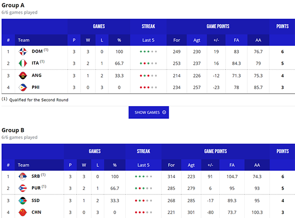 A组的多米尼加3连胜,获得小组第一名,在唐斯的带领下,多米尼加逐渐进入到世界杯的节奏。意大利第二名,从小组赛出线。B组晋级的是3连胜的塞尔维亚和2胜1负的波多黎各,AB组晋级的这4支球队在第二阶段分在同一个小组。A组出局的是安哥拉和东道主菲律宾,B组被淘汰的是中国男篮和南苏丹,排位赛分在一组,中国男篮想要冲击亚洲最好成绩,必须要击败安哥拉和菲律宾,还得看其他竞争对的脸色。