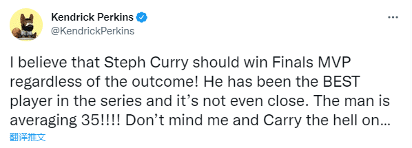 对于库里的总决赛表现,前凯尔特人冠军成员、现NBA名嘴帕金斯发推写道:无论最终结果如何,库里都应该获得总决赛MVP!他一直都是这轮系列赛中最好的那位球员,而且其他人和他差得很远。这个家伙场均能得到35分。