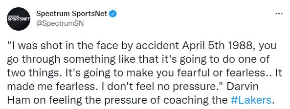 谈到执教湖人队的压力,哈姆说:1988年的时候我的脸被意外击中。这让我无所畏惧。我不觉得有压力,这只是关于篮球的。