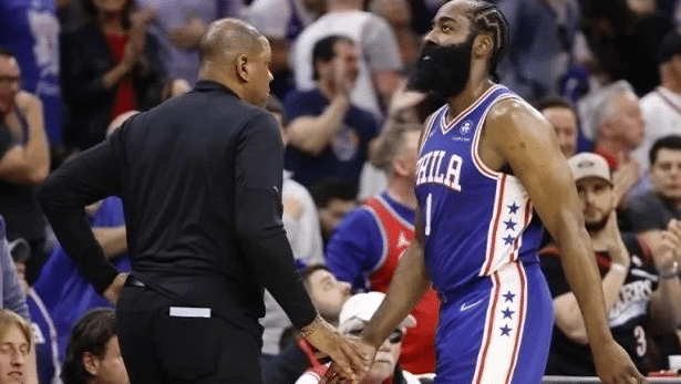 在被热火淘汰出局之后,哈登就表示会留队(执行球员选项或者与76人续约),同时哈登还做出承诺,要竭尽所能在这里取得胜利,并帮助球队尽可能变得更好。这样的言论在当时很吸引人关注,因为哈登刚刚经历了在生死战下半场只出手2次的尴尬比赛,被对手淘汰。