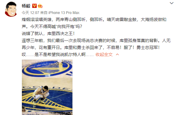 今天比赛结束之后,杨毅在赛后认错的同时不忘毒奶勇士,他直言说错了就认,库里西决之王!库里和勇士杀回来了,不容易!服了!勇士总冠军!