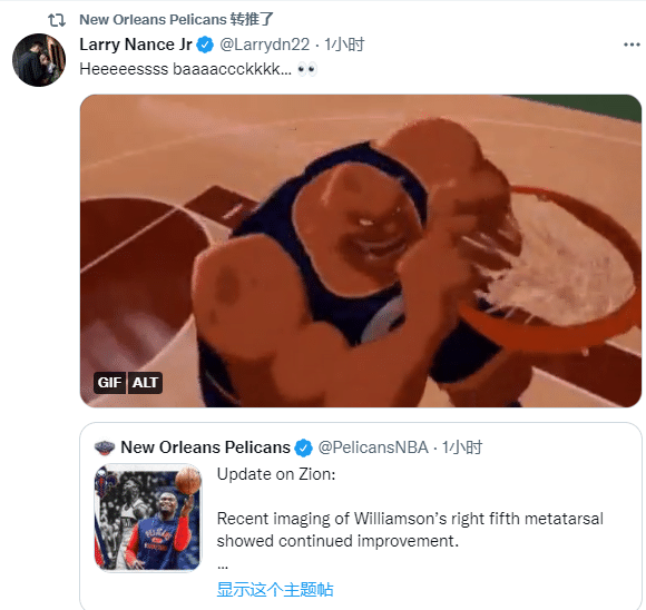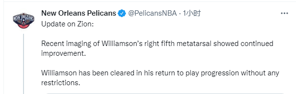 本赛季,21岁锡安伤势反复导致复出多次推迟,因足部伤势缺席了2021-22赛季的所有比赛,如今锡安的足部伤势康复痊愈,已经可以不受任何限制地重返球场;小南斯晒怪兽扣篮动图,发推写道:他回来了;鹈鹕官方转发,也宣布锡安回来了。