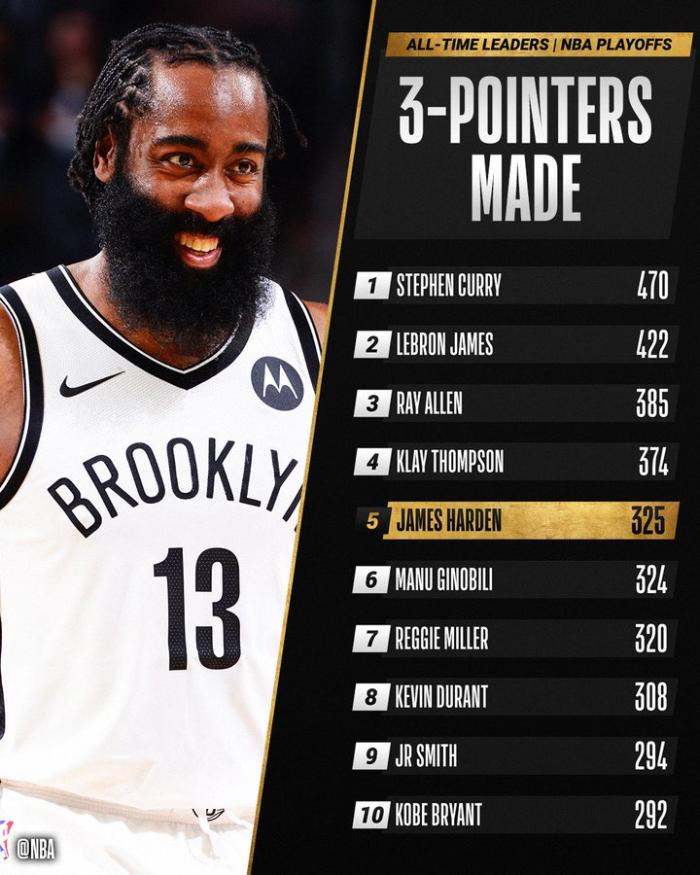 随着哈登首节投进两记三分,季后赛325记三分正式超越吉诺比利升到历史季后赛三分榜第五位,排在哈登前面的依次是库里(470记)、詹姆斯(422记)、雷阿伦(385记)和汤普森(374记)。