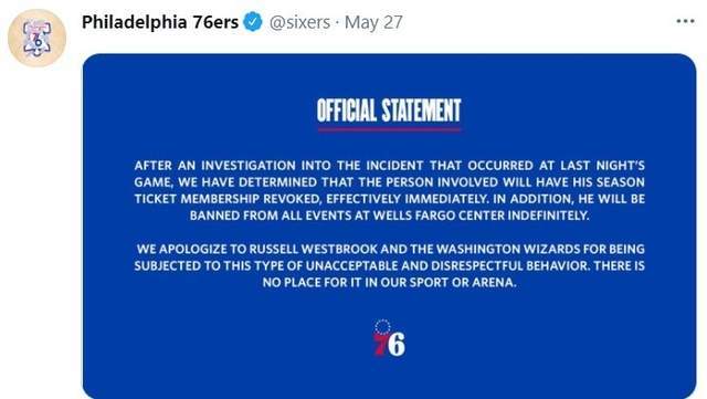 在昨天奇才不敌76人的比赛结束后,走向更衣室的威少被76人主场球迷泼了一盆爆米花,双方也爆发了激烈的冲突。赛后球员们力挺威少,纷纷表示要严惩肇事者。扔爆米花确实是一件很不尊重人的事,更何况是在NBA的比赛球馆里。虽然季后赛中气氛剑拔弩张,但那仅限于场上,比赛结束后还搞这些盘外招未免有些太过分了。而76人官方也很痛恨这种行为,在对比赛中的意外事件进行调查后,决定撤销涉及该事件球迷的季票资格,并且将无限期禁止他参与76人主场的任何活动。76人这波做得还是很好的,对那些没有素质的球迷,我们不欢迎他再参与到比赛当中。