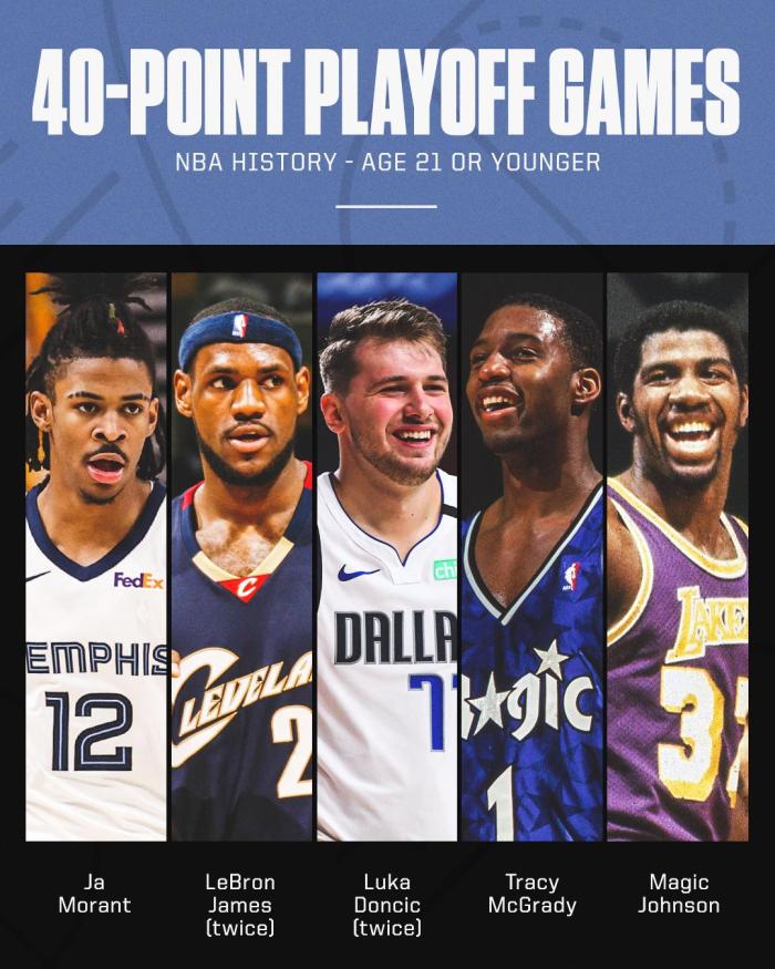 第三、21岁莫兰特比肩詹姆斯、魔术师、东契奇和麦迪,成为历史季后赛第5年轻40+球员。