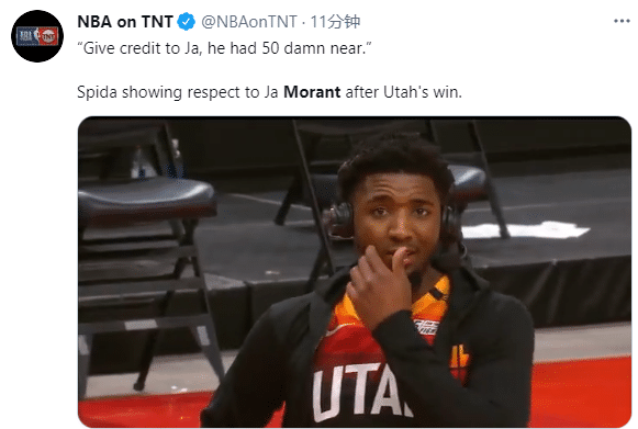 赛后米切尔向莫兰特表达敬意,他表示:莫兰特将近砍下50分,他是个了不起的球员,我很尊重他。