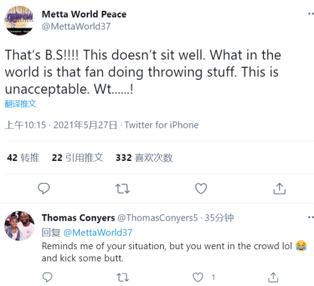 有趣的是阿泰斯特的社交媒体更新后,很多球迷也调侃:如果是阿泰斯特,估计早就冲上看台和这名观众比划下拳脚。在阿泰斯特发声之后,威少的老铁詹姆斯也在社交媒体上发声声援威少,希望联盟可以更好地保护球员。