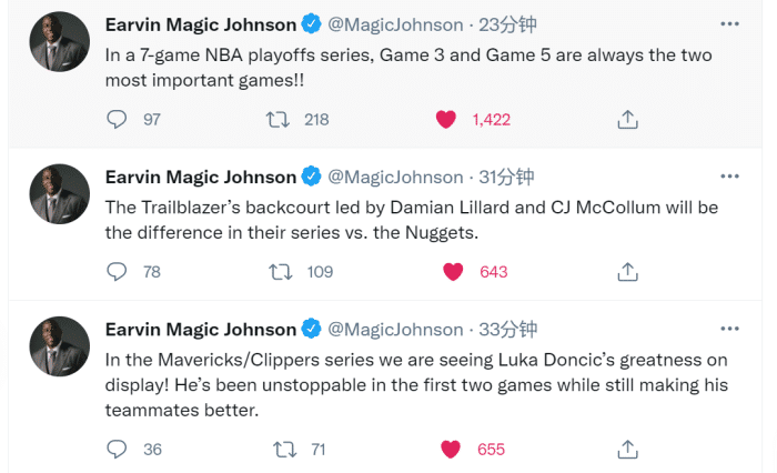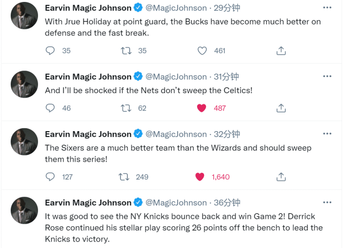 来源:24直播网05-27 15:0624直播网讯 北京时间5月27日,尼克斯主场击败老鹰扳回一城,76人则是大胜奇才将系列赛大比分改写为2比0!湖人名宿魔术师约翰逊向来喜欢在社媒上发表自己对比赛的看法。而就在刚刚,魔术师一下连发了7条推文!