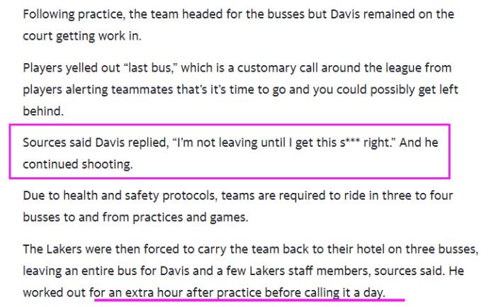 戴维斯在首轮G2的前一天训练至最后一刻,当球队动身离开时,他表示:“我不把这s**t搞定我就不离开。(I’m not leaving until I get this s**t right)”当时训练结束后大家要返回酒店,最终其他人只能乘坐三辆大巴离开,留下一辆大巴等待浓眉和一些工作人员。