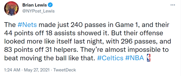 比起第一场比赛,篮网在球的转移方面做得更好了,这也有助于他们打出更高效的进攻。篮网记者Brian Lewis对比了G1和G2的传球数据。第一场比赛,篮网只有240次传球,他们全场18次助攻,靠助攻获得的分数是44分。第二场比赛,篮网全队有296次传球,全场31次助攻,靠助攻获得的分数是83分。Lewis晒出数据后得出结论:当球的转移做到这个程度时,篮网几乎不可能被击败。