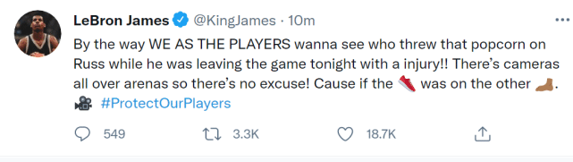 这一事件也引起热议,很快冲上热搜。詹姆斯显然看了这场比赛,发推力挺威少:“作为球员,我们想知道那个在威少伤退时冲他扔爆米花的人是谁!球馆各个位置都有摄像机,因此没有任何借口!请保护我们的球员。”