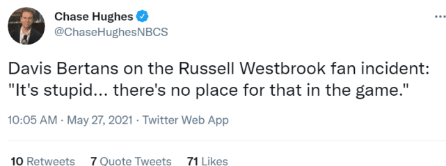 威少本人也回应了这件事。“人们可不敢在街上冲着我的脑袋扔爆米花,因为你知道接下来会发生什么……在这些球馆里,你得开始保护球员,我们拭目以待看看联盟怎么做。”