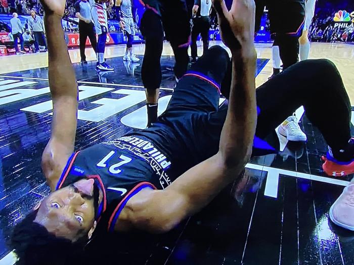 恩比德庆祝动作引热议!倒地吐舌狂秀好腰,美媒:狂野+MVP级庆祝