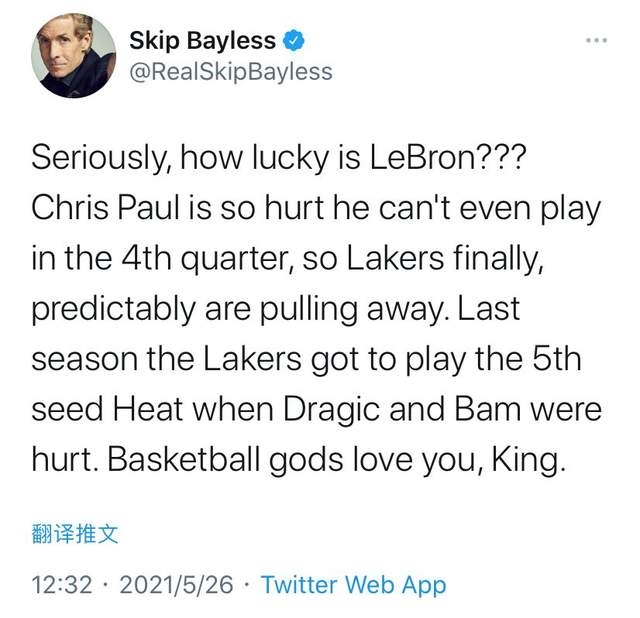 不知道是不是巧合,詹姆斯这两年的季后赛对手几乎都遭遇了不同程度的伤病,之前在总决赛对阵热火的时候,热火方面的阿德巴约和德拉季奇就受伤了,如今太阳的保罗又受伤了。而这种巧合也引起了美国当地一个著名詹黑的不满,这个名为Skip的詹黑在社交媒体上发文,他认为詹姆斯是这个世界上最幸运的人,之前遇到了阿德巴约和德拉季奇的伤病,现在保罗又受伤了。