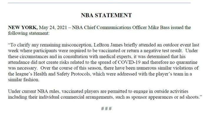 来源:24直播网05-25 09:4624直播网讯 北京时间5月25日,此前詹姆斯因参加私下活动而违反联盟防疫协议,不过联盟并没有让其禁赛;如今NBA官方针对这件事正式发表声明,解释为何詹姆斯没有被隔离,因为在场的人都接种疫苗或者检查结果呈阴性,专家认为这没有传播病毒的风险。