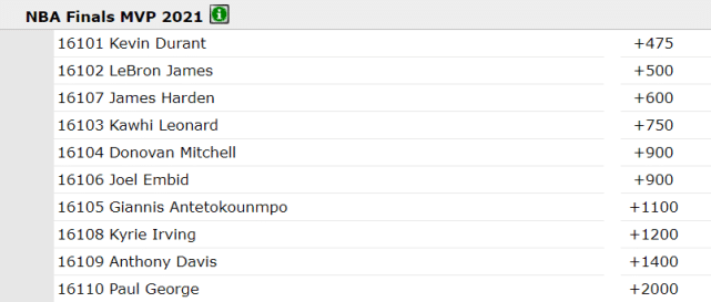 24直播网讯 北京时间5月24日,2020-21赛季的季后赛首轮才刚刚开打,但总决赛MVP的赔率竟然已经出炉!在这份FMVP赔率排名上,一共有32名球员在列。篮网球星杜兰特目前以+475的赔率位居第一,以微弱优势领先湖人球星詹姆斯(+500)。