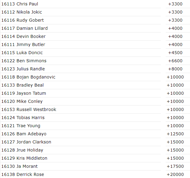榜单排名第11-20位的球星依次是11.保罗(+3300)、12.约基奇(+3300)、13.戈贝尔(+3300)、14.利拉德(+4000)、15.布克(+4000)、16.巴特勒(+4000)、17.东契奇(+4500)、18.西蒙斯(+6600)、19.兰德尔(+8000)、20.博扬-博格达诺维奇(+10000)。
