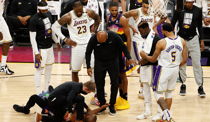 24直播网讯 今天湖人的球迷们一定是最遗憾的,他们的主队在季后赛首战中遗憾的以9分之差输给太阳,无缘季后赛开门红。这场比赛除了胜负之外,最令人关注的要说是詹姆斯险些受伤,末节自己罚球不中准备补篮的时候,起跳却被身旁的保罗给拉拽了胳膊,痛苦倒地之后起身去到场边,表情也很难受。好在詹姆斯没有大碍,赛后他也亲承不会影响到下一场比赛。