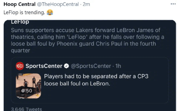 詹姆斯和保罗的行为也引发了热议,有球迷批评保罗的小动作太多,太脏了。还有不少的球迷抨击詹姆斯假摔,这其中还创造了一个新词汇,就是“LeFlop”指的是詹姆斯假摔,这个词汇中“Le”指的是詹姆斯,而后面的“Flop”就是假摔的意思。