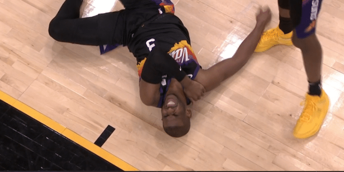 保罗心情沮丧,用毛巾捂着头,因伤被迫离场并且返回更衣室接受检查,随后保罗重返替补席;受伤下场前,保罗首发上场10分钟2投1中拿到3分4篮板你5助攻1抢断,他是太阳队的核心指挥官,意外受伤离场,所幸36岁保罗伤无大碍,又重返赛场。