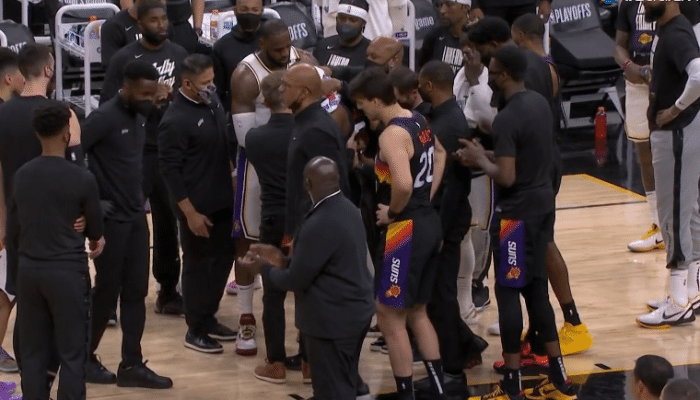 24直播网讯 北京时间5月24日,湖人太阳首轮G1正式开打,第二节场上发生受伤事件,36岁保罗受伤离场,詹姆斯第一时间拥抱并安慰CP3;目前他已经重返替补席,伤势应该无大碍。