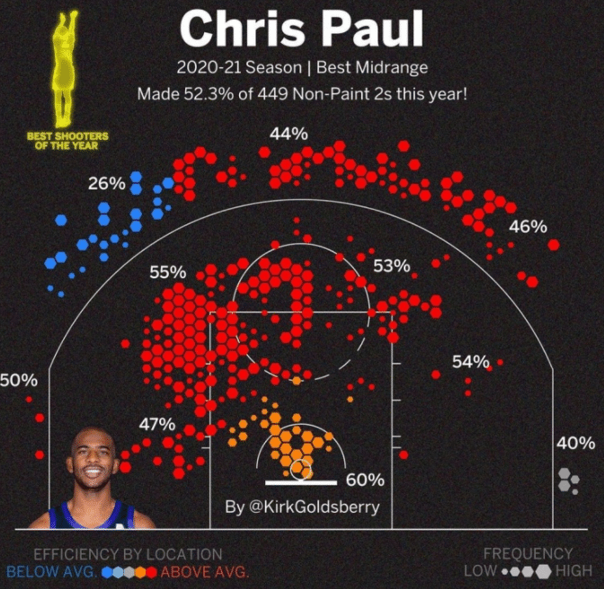 詹姆斯想要带队黑七,得问问同样都是香蕉船兄弟的保罗,根据数据专家Kirk Goldsberry的统计显示,保罗还是本赛季联盟的中投王,他在非油漆区的中距离一共命中了235球,并且命中率高达52.3%,这样的命中数和命中率都是非常高的,说保罗是中投王并不为过。