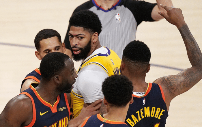 詹姆斯在地板上躺了很长时间才缓慢起身,眼睛看起来有点睁不开,这让人想起了当年骑士和勇士的总决赛,格林几年前就曾戳到过老詹的眼睛,那时候的情况更加严重,詹姆斯眼睛充血。