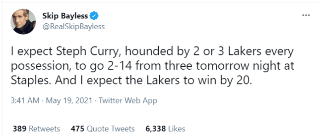 来源:24直播网05-20 16:2724直播网讯 北京时间5月20日,被称为“头号詹黑”的名嘴斯基普-贝勒斯,对湖人和勇士的附加赛进行了预测。贝勒斯在社媒上写道:“我预计斯蒂芬-库里会在每个回合遭遇湖人的2-3人包夹防守,三分球只有14中2的表现,另外,我预计湖人以20分优势获胜。”