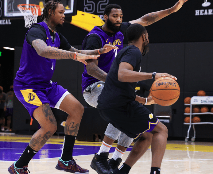 湖人备战勇士,提前演练包夹库里战术:庄神认真!双塔表情神同步