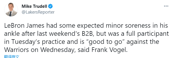 湖人主教练沃格尔透露,打完收官战之后詹姆斯的脚踝有些轻微酸痛,不过詹姆斯参加了今天的全部训练,无碍对阵勇士;詹姆斯脚伤无大碍,他和浓眉都会出战这场关键大战。
