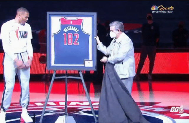 在奇才和骑士队比赛前,奇才主场举办了简单的仪式为威少颁发182场三双特制纪念版球衣,表彰威少这个赛季神奇的表现,已经他在三双领域独一无二的历史地位。