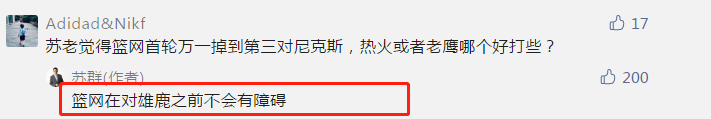 不过,苏群老师也直言,篮网打雄鹿未必就一定能赢,这轮系列赛不好说。网友提问,“苏老师,如果东部半决赛篮网和雄鹿相遇,你看好谁胜出”。