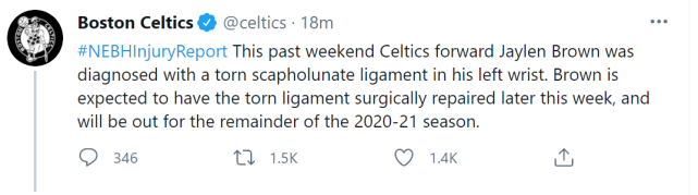 来源:24直播网05-11 10:2524直播网讯 北京时间5月11日,凯尔特人官方宣布,前锋杰伦-布朗被诊断出左手腕舟月韧带撕裂,预计将在本周晚些时候接受手术治疗,已经确定缺席2020-21赛季余下的所有比赛。布朗的赛季报销,对凯尔特人而言,无疑是一次沉重的打击!
