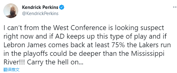 浓眉已经找回状态并且打出统治力,詹姆斯也即将伤愈复出,对于湖人来说真是好消息;对于湖人现状,名嘴帕金斯发推写道:如果浓眉保持这样的进攻状态,詹姆斯能够找回75%的状态,那么湖人将像密西西比河一样深不可测。