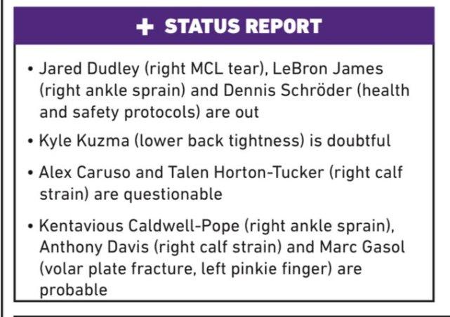 来源:24直播网05-09 15:0224直播网讯 北京时间5月9日,湖人官方更新了明天对太阳的伤病名单,球队的伤病问题变得更加严重。除了詹姆斯(右踝扭伤)、施罗德(健康安全协议)、杜德利(韧带撕裂)三人确定继续缺阵,库兹马(背部紧张)的状态变成doubtful(大概率不打,25%可能上场),卡鲁索和霍顿-塔克是questionable(出战成疑,50%可能上场),波普、浓眉、小加都是probable(大概率出战,75%可能上场)。