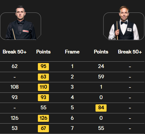 第4局:卡特开球失误,留下进攻机会。塞尔比打进红球并凭借单杆93分完成一杆制胜,将比分拉大为4-0。
