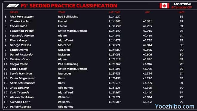 24直播网讯 加拿大站二练,红牛车手马克斯·维斯塔潘以1分14秒127的成绩排名第一,勒克莱尔落后0.081秒位居第二,赛恩斯第三,维特尔第四,另外前十名的车手还有:阿隆索、加斯利、拉塞尔、诺里斯、里卡多、奥康。