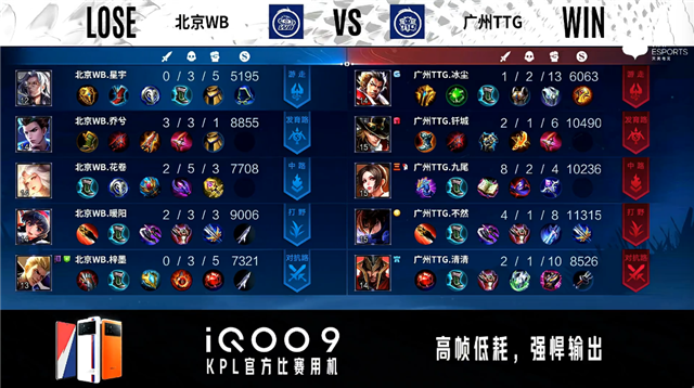 开局北京WB中路公孙离抢线。1分29秒北京WB中路击杀孙膑拿到一血。2分12秒北京WB拿下暴君。2分51秒广州TTG中路击杀弈星。5分22秒北京WB拿下主宰。5分41秒北京WB摧毁敌方发育路外塔。7分43秒北京WB中路打出0换2并摧毁敌方中路外塔。8分03秒北京WB摧毁敌方发育路二塔。9分28秒北京WB摧毁敌方中路二塔。9分41秒北京WB摧毁敌方对抗路二塔。9分55秒北京WB拿下主宰。10分20秒北京WB拿下暗影主宰。11分25秒北京WB摧毁敌方中路高地塔。12分05秒北京WB拿下暗影暴君。12分56秒北京WB摧毁敌方发育路高地塔。14分07秒北京WB拿下暗影主宰。15分17秒北京WB摧毁敌方水晶拿下比赛。