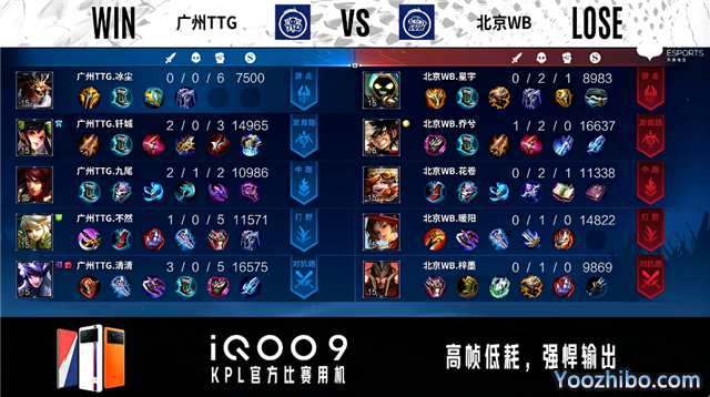 双方常规开局。2分整广州TTG中路击杀杨玉环拿到一血。2分32秒北京WB抢到暴君,广州TTG打出1换3。4分22秒野区团战广州TTG打出0换2。6分43秒北京WB中路击杀夏侯惇。7分20秒中路团战广州TTG打出2换3,成吉思汗拿到三连决胜。8分45秒对抗路团战广州TTG打出2换3。10分24秒广州TTG拿下暗影主宰。11分12秒广州TTG摧毁敌方中路二塔。11分45秒中路团战广州TTG打出1换2。12分01秒广州TTG摧毁敌方对抗路高地塔。13分03秒广州TTG中路击杀猪八戒。13分18秒广州TTG摧毁敌方中路高地塔。13分31秒广州TTG摧毁敌方水晶拿下比赛。