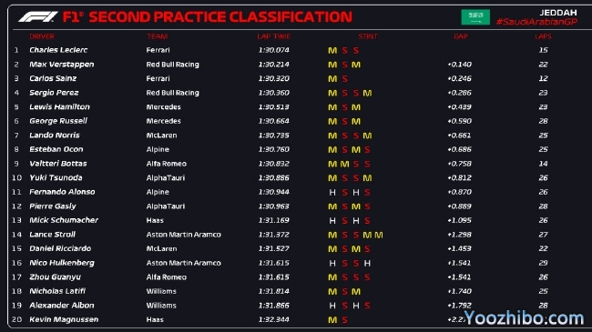 2022年F1沙特大奖赛第2次练习赛成绩表: