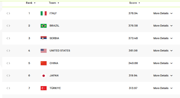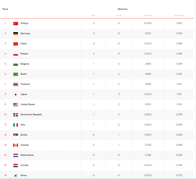 土耳其女排位居第一,在3-1击败塞尔维亚之后,她们迎来两连胜,目前高居战绩榜第一名的位置。